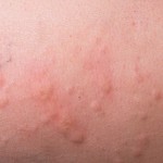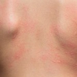 Affects approximately 1 in 5 people at some time during their lives. Acute urticaria has a sudden onset of symptoms that include raised, pruritic, red or skin-colored bumps, often referred to as hives or wheals that blanch when pressure is applied (i.e., the center of hive turns white when pressed). Hives can occur anywhere on the body; may reappear and disappear over short periods of time; may change shape; or be described as “moving around”. Itching associated with acute urticaria may be mild to severe and may be exacerbated by scratching, rubbing, alcoholic beverages, exercise, heat, and emotional stress.