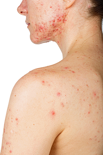 A common skin condition involving blockage and/or inflammation of hair follicles and associated sebaceous glands, most often affecting the face, upper back, and chest. Acne may present as inflammatory lesions (e.g., papules, pustules, cysts, nodules), noninflammatory lesions (e.g., open or closed comedones known as blackheads and whiteheads), or a mixture of both.