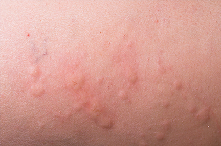 Affects approximately 1 in 5 people at some time during their lives. Acute urticaria has a sudden onset of symptoms that include raised, pruritic, red or skin-colored bumps, often referred to as hives or wheals that blanch when pressure is applied (i.e., the center of hive turns white when pressed). Hives can occur anywhere on the body; may reappear and disappear over short periods of time; may change shape; or be described as “moving around”. Itching associated with acute urticaria may be mild to severe and may be exacerbated by scratching, rubbing, alcoholic beverages, exercise, heat, and emotional stress.