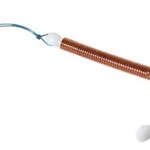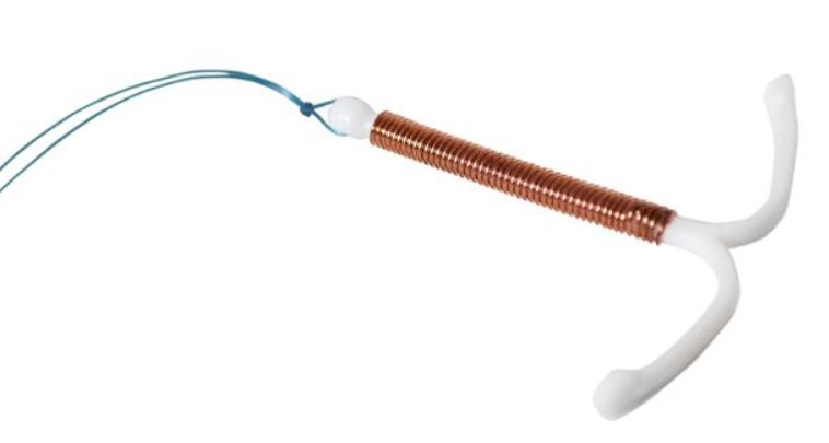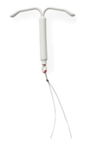 A small, T-shaped device inserted into the uterus and left in place long-term as a method to prevent conception. The two categories of intrauterine device (IUD) are: hormonal, using locally released progesterone (e.g., Mirena); and copper (e.g., ParaGard). Both are made primarily of plastic; ParaGard contains a spiral of copper around the vertical aspect of the device. Strings connected to the base of the device remain in place as a means for removal and assessing placement long-term and may be felt or visualized upon examination. IUDs do not protect against sexually transmitted infections.