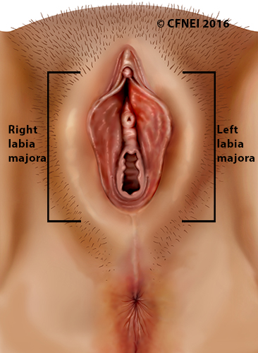 Two thick, longitudinal folds of skin on either side of the labia minora, extending from the mons pubis to the perineum and forming the lateral boundaries of the vulva. This outer surface skin is pigmented with sebaceous glands and covered with coarse hair after puberty. The inner surface skin is smooth and hairless. Singular term is labia majus.