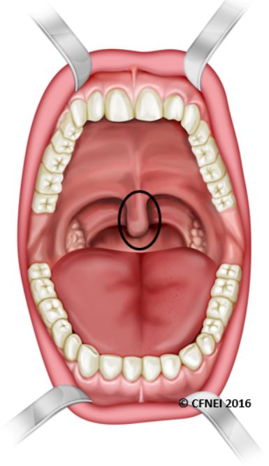 A small, fleshy protrusion of soft tissue from the soft palate in the back of the throat. Comprised of muscle, connective tissue, and mucous membrane, it functions to aid speech and help prevent food or liquid from entering the nasal cavity.