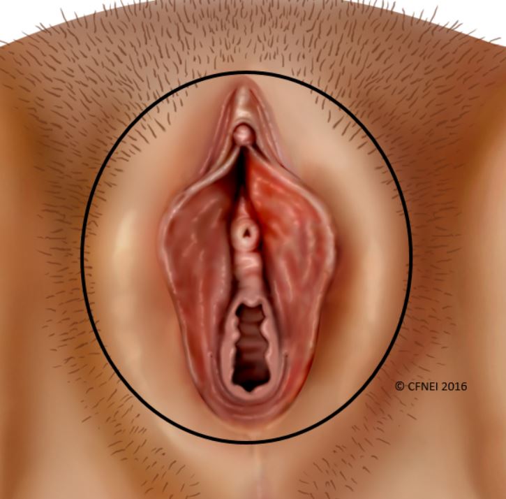 An area of the female genitalia lying posterior to the mons pubis; includes the labia majora, labia minora, clitoris, vaginal vestibule, vaginal introitus, and Bartholin glands.
